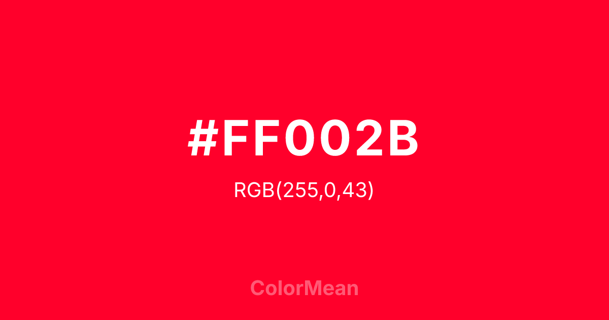 #FF002B RGB value is (255, 0, 43). The hex color red value is 255, green is 0, and blue is 43. Its HSL format shows a hue of 350°, saturation of 100 percent, and lightness of 50 percent. The CMYK process values are 0 percent, 100 percent, 83 percent, 0 percent.