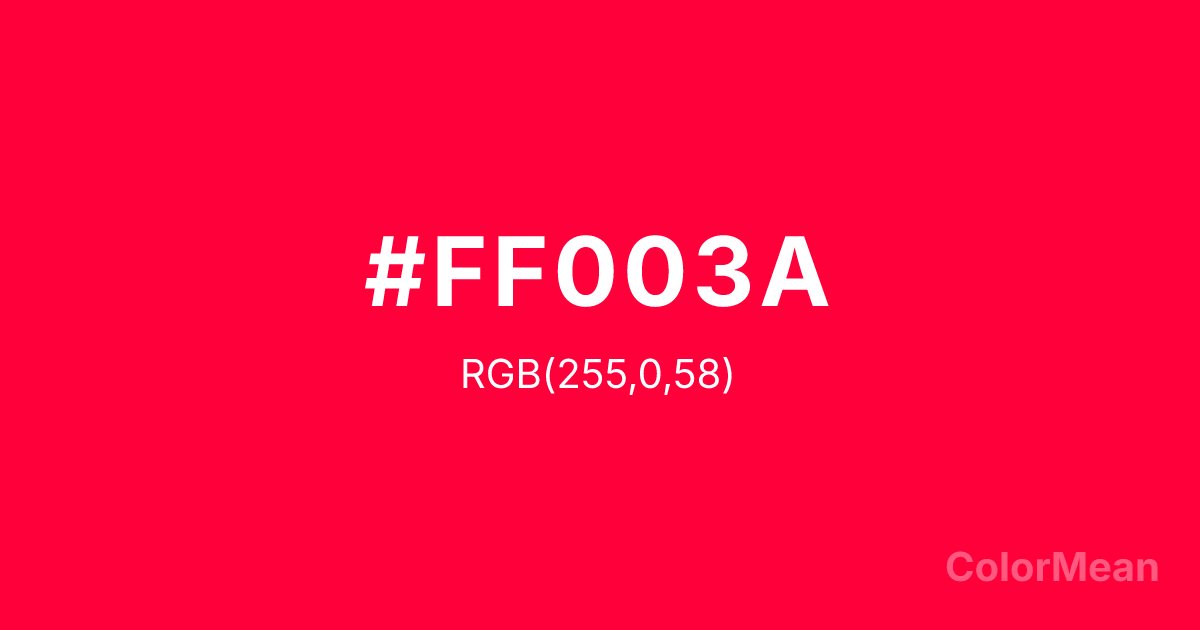 #FF003A RGB value is (255, 0, 58). The hex color red value is 255, green is 0, and blue is 58. Its HSL format shows a hue of 346°, saturation of 100 percent, and lightness of 50 percent. The CMYK process values are 0 percent, 100 percent, 77 percent, 0 percent.
