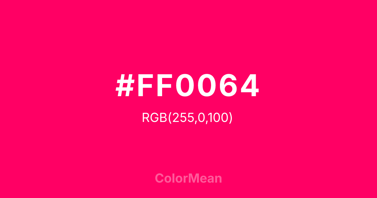 #FF0064 RGB value is (255, 0, 100). The hex color red value is 255, green is 0, and blue is 100. Its HSL format shows a hue of 336°, saturation of 100 percent, and lightness of 50 percent. The CMYK process values are 0 percent, 100 percent, 61 percent, 0 percent.