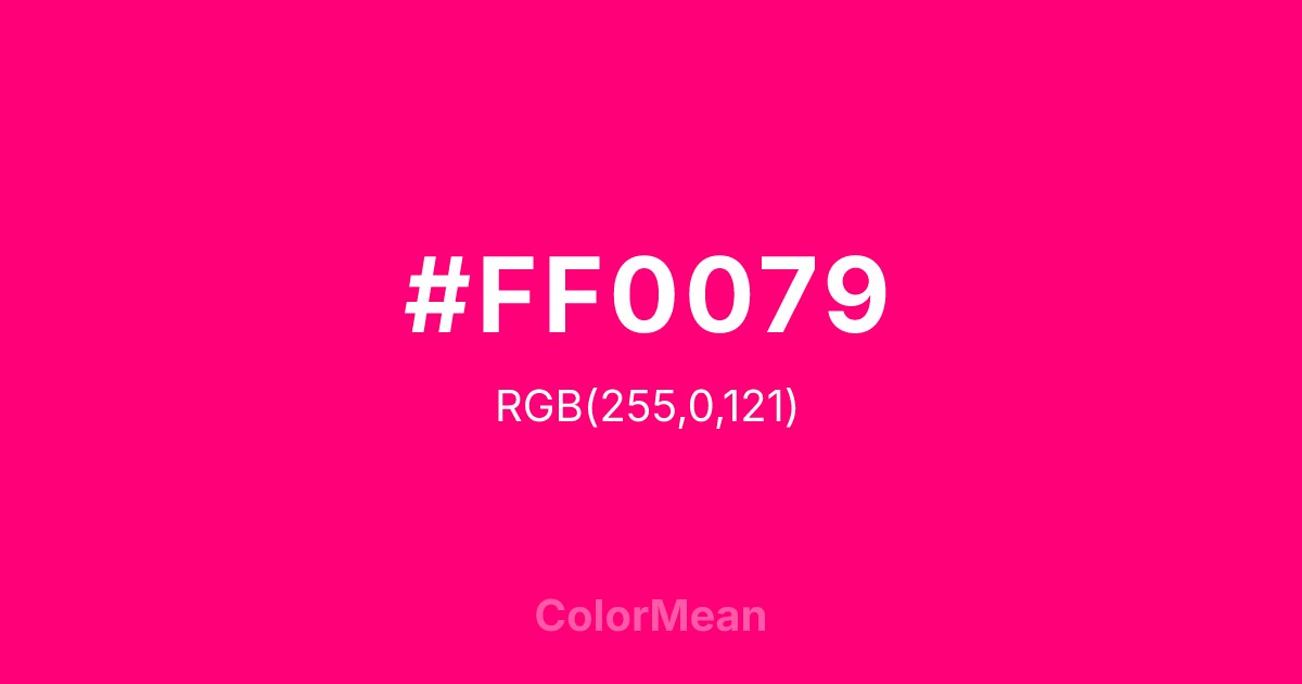 #FF0079 RGB value is (255, 0, 121). The hex color red value is 255, green is 0, and blue is 121. Its HSL format shows a hue of 332°, saturation of 100 percent, and lightness of 50 percent. The CMYK process values are 0 percent, 100 percent, 53 percent, 0 percent.