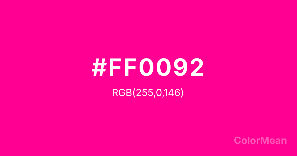 #FF0092 RGB value is (255, 0, 146). The hex color red value is 255, green is 0, and blue is 146. Its HSL format shows a hue of 326°, saturation of 100 percent, and lightness of 50 percent. The CMYK process values are 0 percent, 100 percent, 43 percent, 0 percent.