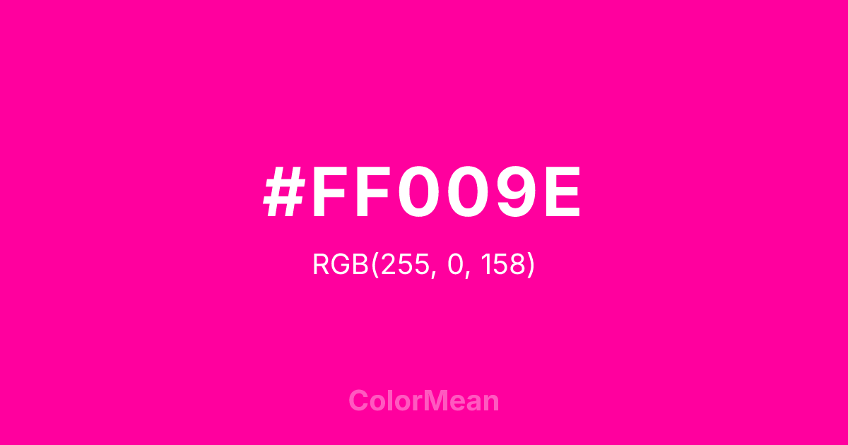 #FF009E RGB value is (255, 0, 158). The hex color red value is 255, green is 0, and blue is 158. Its HSL format shows a hue of 323°, saturation of 100 percent, and lightness of 50 percent. The CMYK process values are 0 percent, 100 percent, 38 percent, 0 percent.