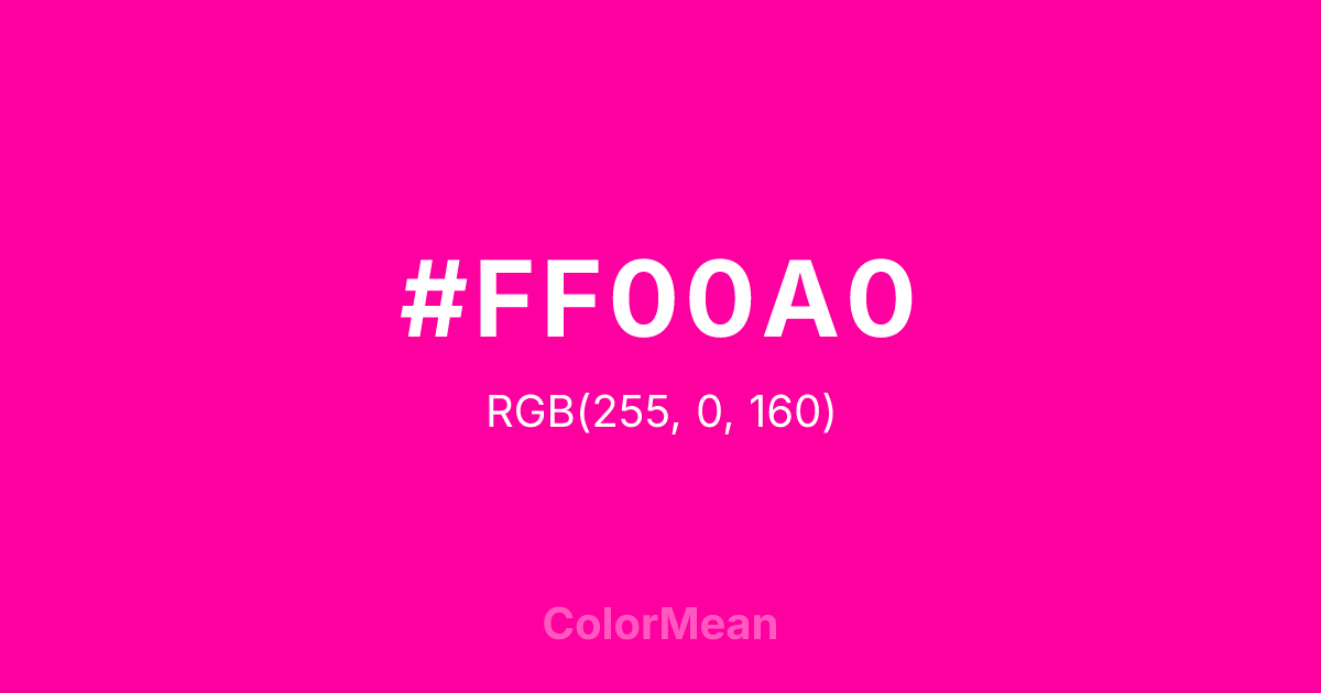 #FF00A0 RGB value is (255, 0, 160). The hex color red value is 255, green is 0, and blue is 160. Its HSL format shows a hue of 322°, saturation of 100 percent, and lightness of 50 percent. The CMYK process values are 0 percent, 100 percent, 37 percent, 0 percent.