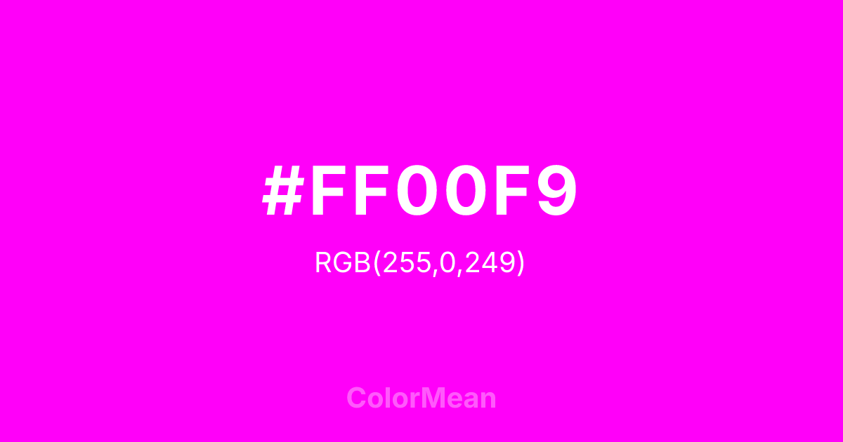 #FF00F9 RGB value is (255, 0, 249). The hex color red value is 255, green is 0, and blue is 249. Its HSL format shows a hue of 301°, saturation of 100 percent, and lightness of 50 percent. The CMYK process values are 0 percent, 100 percent, 2 percent, 0 percent.