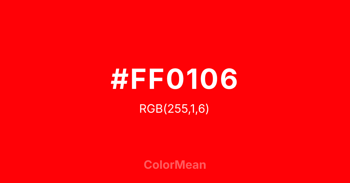 #FF0106 RGB value is (255, 1, 6). The hex color red value is 255, green is 1, and blue is 6. Its HSL format shows a hue of 359°, saturation of 100 percent, and lightness of 50 percent. The CMYK process values are 0 percent, 100 percent, 98 percent, 0 percent.