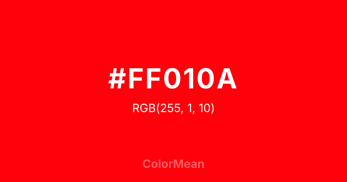 #FF010A RGB value is (255, 1, 10). The hex color red value is 255, green is 1, and blue is 10. Its HSL format shows a hue of 358°, saturation of 100 percent, and lightness of 50 percent. The CMYK process values are 0 percent, 100 percent, 96 percent, 0 percent.