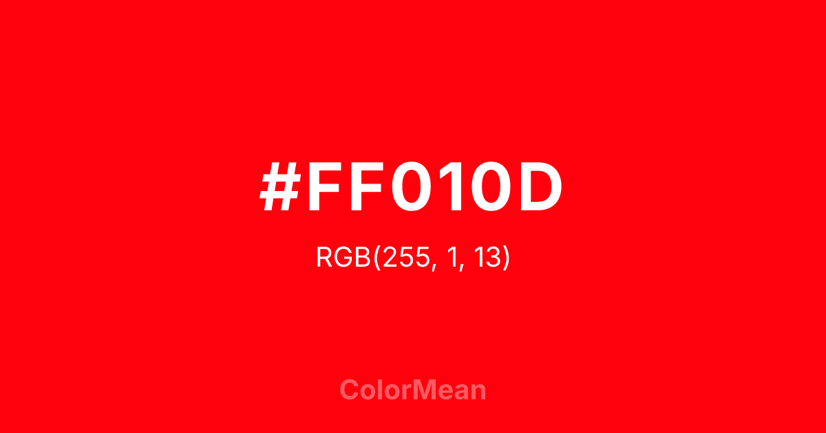 #FF010D RGB value is (255, 1, 13). The hex color red value is 255, green is 1, and blue is 13. Its HSL format shows a hue of 357°, saturation of 100 percent, and lightness of 50 percent. The CMYK process values are 0 percent, 100 percent, 95 percent, 0 percent.