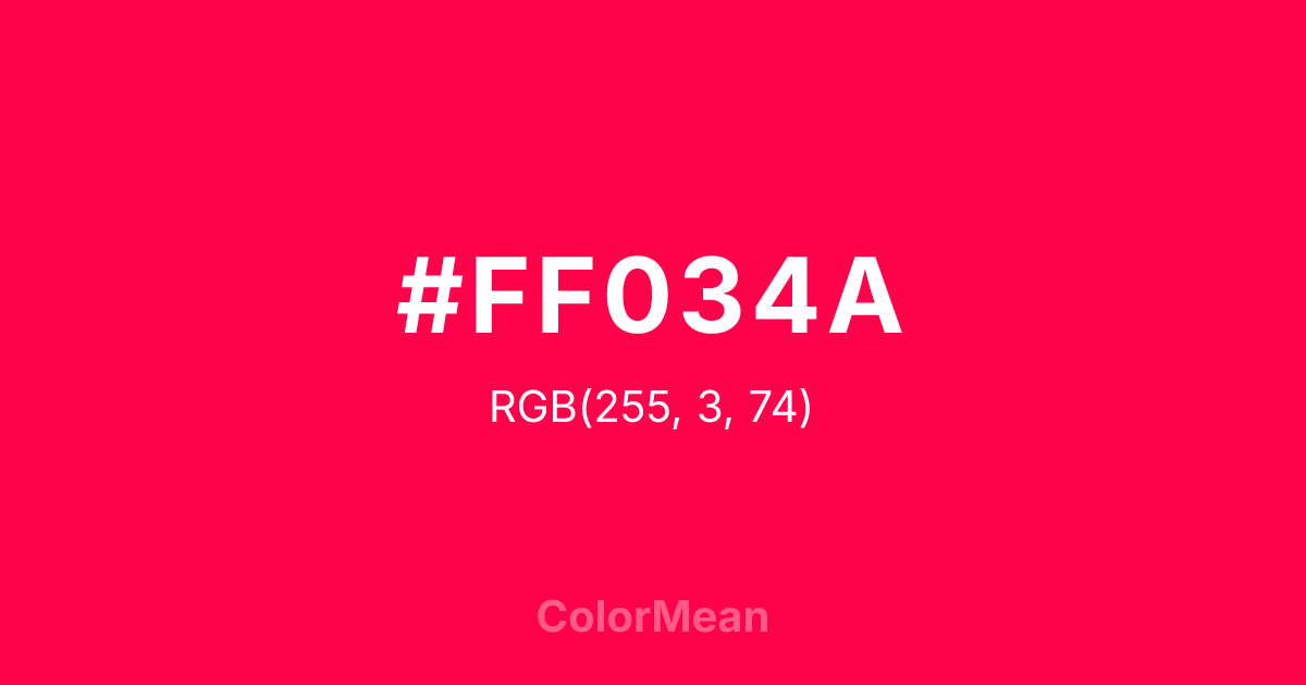 #FF034A RGB value is (255, 3, 74). The hex color red value is 255, green is 3, and blue is 74. Its HSL format shows a hue of 343°, saturation of 100 percent, and lightness of 51 percent. The CMYK process values are 0 percent, 99 percent, 71 percent, 0 percent.