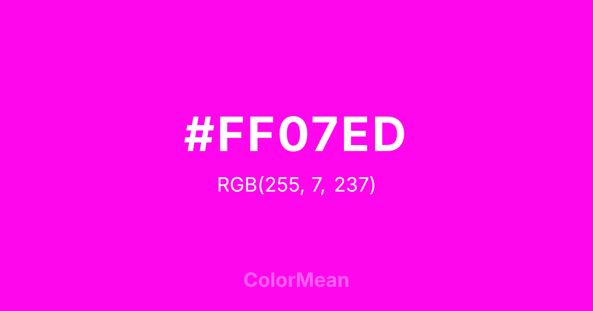 #FF07ED RGB value is (255, 7, 237). The hex color red value is 255, green is 7, and blue is 237. Its HSL format shows a hue of 304°, saturation of 100 percent, and lightness of 51 percent. The CMYK process values are 0 percent, 97 percent, 7 percent, 0 percent.