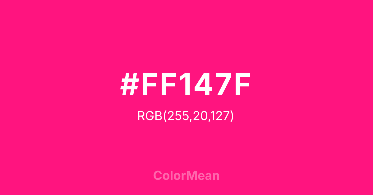 #FF147F RGB value is (255, 20, 127). The hex color red value is 255, green is 20, and blue is 127. Its HSL format shows a hue of 333°, saturation of 100 percent, and lightness of 54 percent. The CMYK process values are 0 percent, 92 percent, 50 percent, 0 percent.