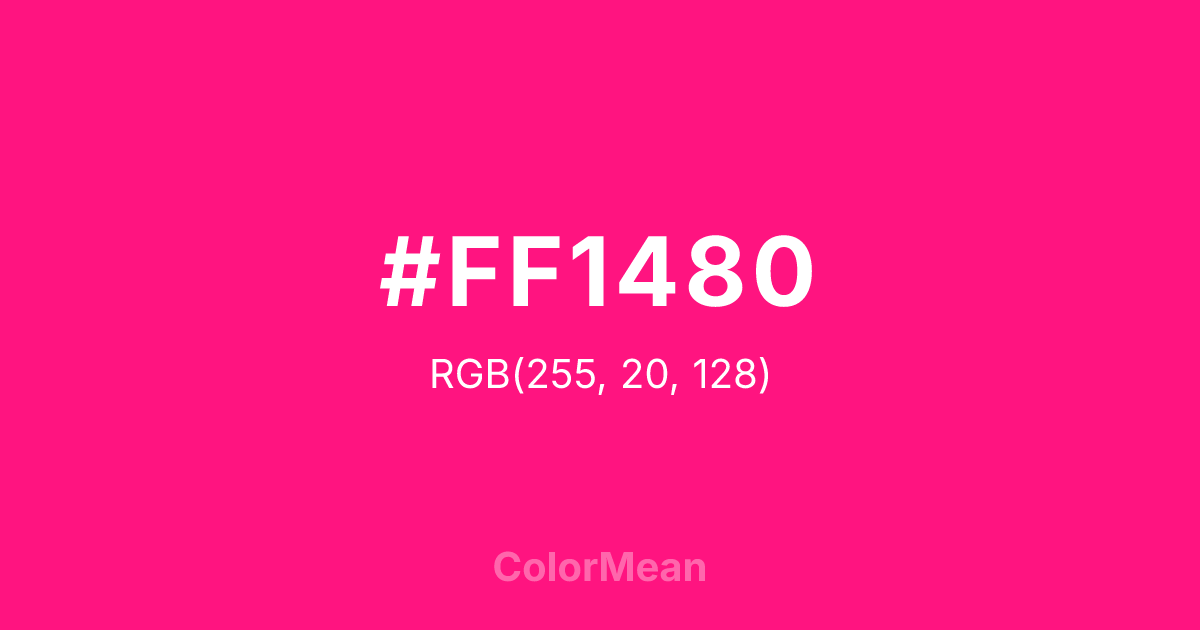 #FF1480 RGB value is (255, 20, 128). The hex color red value is 255, green is 20, and blue is 128. Its HSL format shows a hue of 332°, saturation of 100 percent, and lightness of 54 percent. The CMYK process values are 0 percent, 92 percent, 50 percent, 0 percent.
