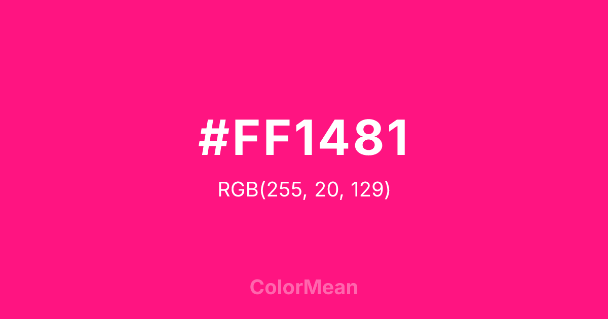 #FF1481 RGB value is (255, 20, 129). The hex color red value is 255, green is 20, and blue is 129. Its HSL format shows a hue of 332°, saturation of 100 percent, and lightness of 54 percent. The CMYK process values are 0 percent, 92 percent, 49 percent, 0 percent.
