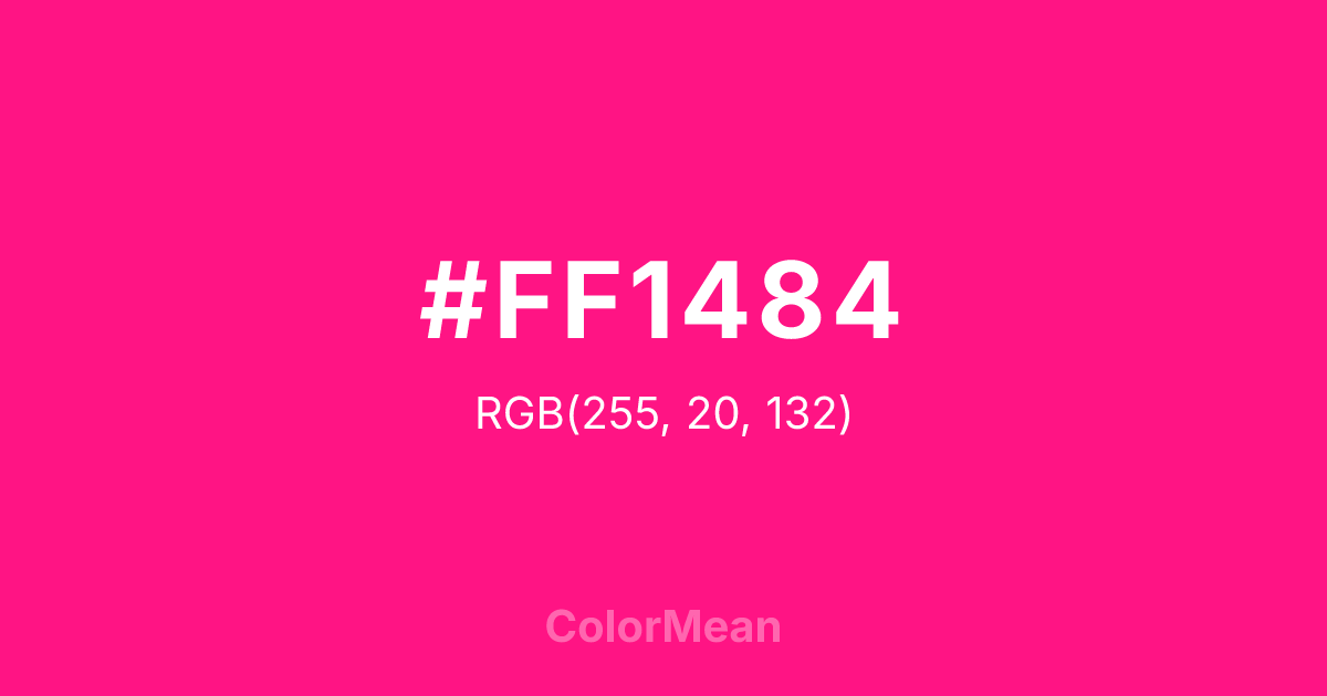 #FF1484 RGB value is (255, 20, 132). The hex color red value is 255, green is 20, and blue is 132. Its HSL format shows a hue of 331°, saturation of 100 percent, and lightness of 54 percent. The CMYK process values are 0 percent, 92 percent, 48 percent, 0 percent.