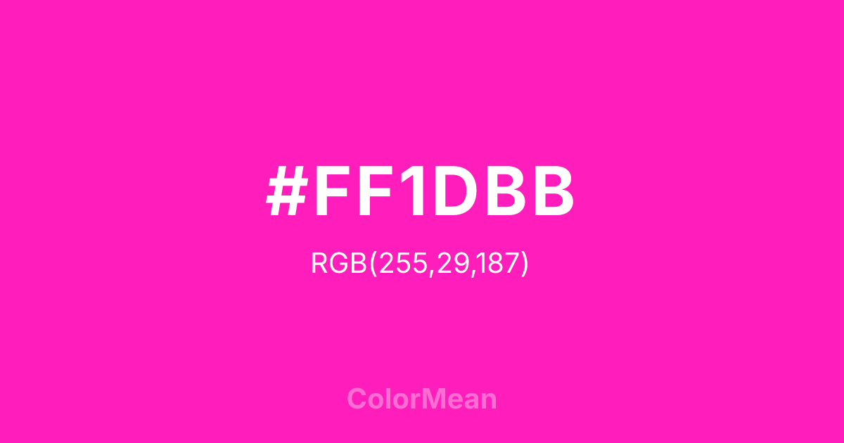 #FF1DBB RGB value is (255, 29, 187). The hex color red value is 255, green is 29, and blue is 187. Its HSL format shows a hue of 318°, saturation of 100 percent, and lightness of 56 percent. The CMYK process values are 0 percent, 89 percent, 27 percent, 0 percent.