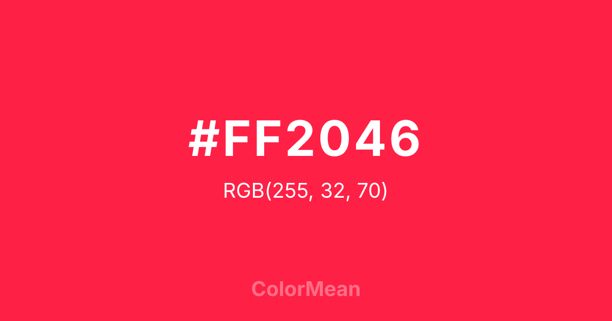 #FF2046 RGB value is (255, 32, 70). The hex color red value is 255, green is 32, and blue is 70. Its HSL format shows a hue of 350°, saturation of 100 percent, and lightness of 56 percent. The CMYK process values are 0 percent, 87 percent, 73 percent, 0 percent.