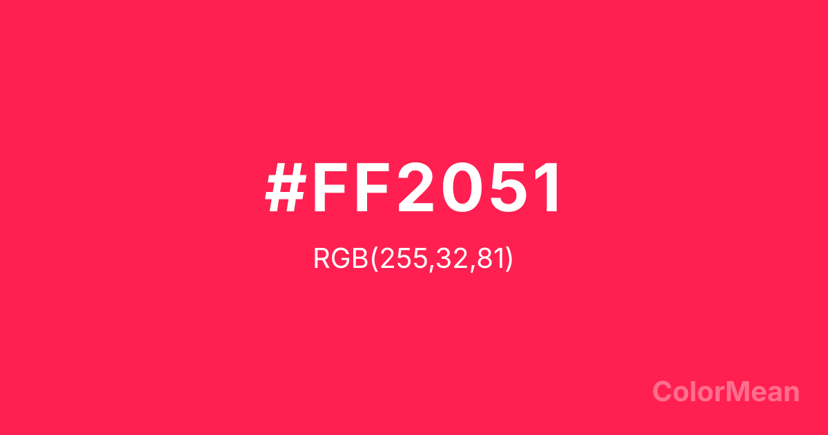 #FF2051 RGB value is (255, 32, 81). The hex color red value is 255, green is 32, and blue is 81. Its HSL format shows a hue of 347°, saturation of 100 percent, and lightness of 56 percent. The CMYK process values are 0 percent, 87 percent, 68 percent, 0 percent.