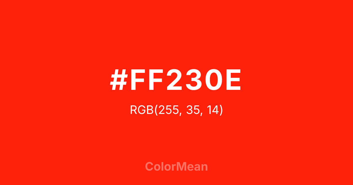 #FF230E RGB value is (255, 35, 14). The hex color red value is 255, green is 35, and blue is 14. Its HSL format shows a hue of 5°, saturation of 100 percent, and lightness of 53 percent. The CMYK process values are 0 percent, 86 percent, 95 percent, 0 percent.