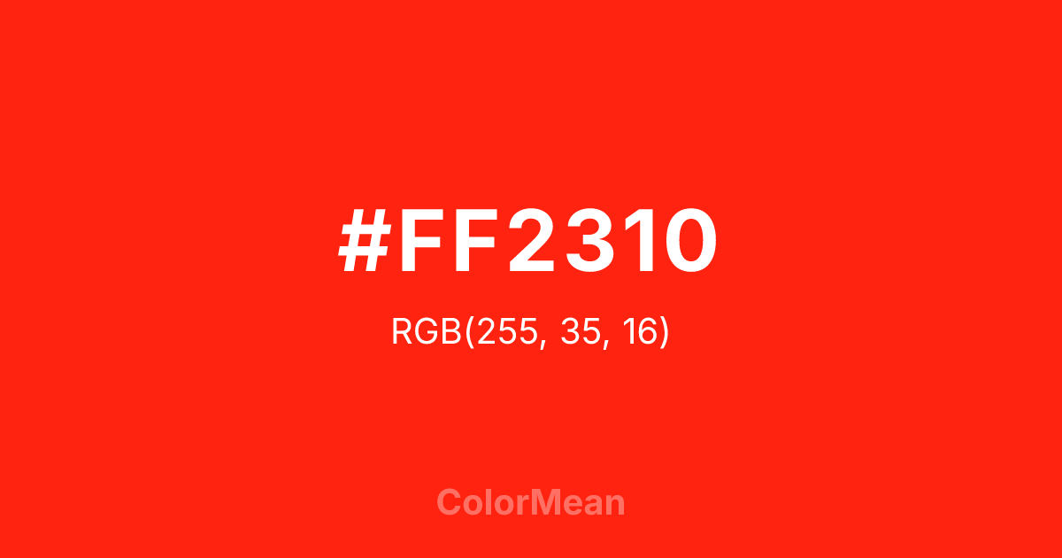 #FF2310 RGB value is (255, 35, 16). The hex color red value is 255, green is 35, and blue is 16. Its HSL format shows a hue of 5°, saturation of 100 percent, and lightness of 53 percent. The CMYK process values are 0 percent, 86 percent, 94 percent, 0 percent.