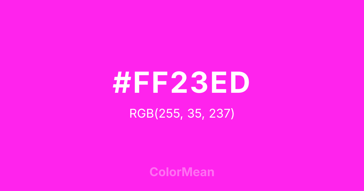 #FF23ED RGB value is (255, 35, 237). The hex color red value is 255, green is 35, and blue is 237. Its HSL format shows a hue of 305°, saturation of 100 percent, and lightness of 57 percent. The CMYK process values are 0 percent, 86 percent, 7 percent, 0 percent.