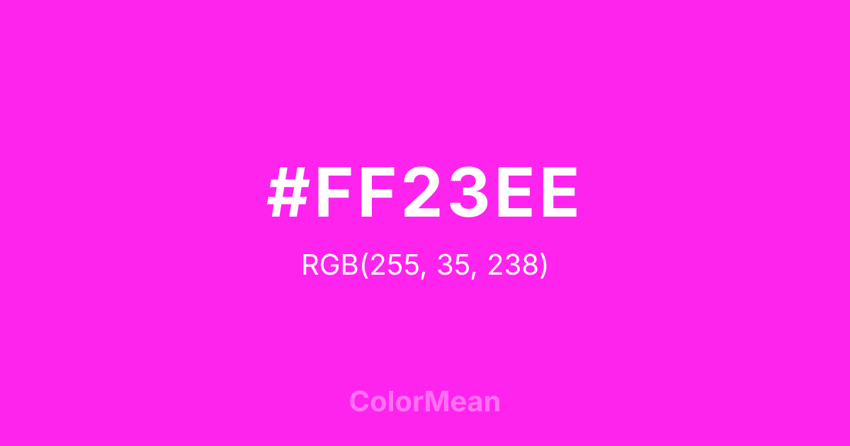 #FF23EE RGB value is (255, 35, 238). The hex color red value is 255, green is 35, and blue is 238. Its HSL format shows a hue of 305°, saturation of 100 percent, and lightness of 57 percent. The CMYK process values are 0 percent, 86 percent, 7 percent, 0 percent.