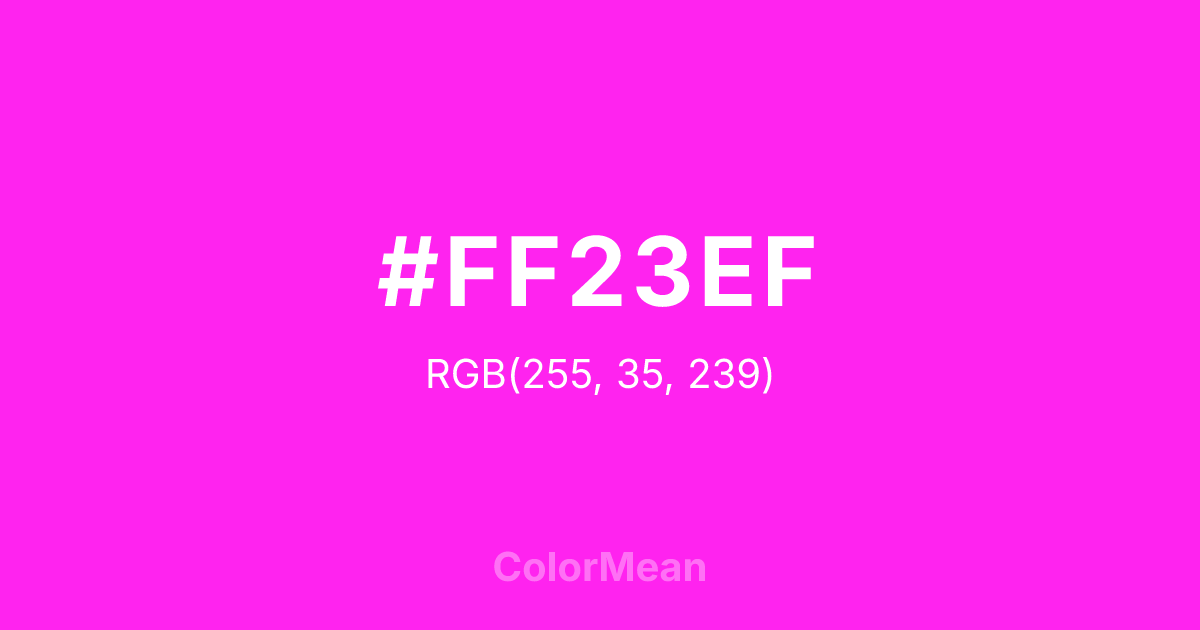 #FF23EF RGB value is (255, 35, 239). The hex color red value is 255, green is 35, and blue is 239. Its HSL format shows a hue of 304°, saturation of 100 percent, and lightness of 57 percent. The CMYK process values are 0 percent, 86 percent, 6 percent, 0 percent.
