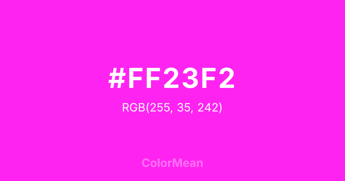 #FF23F2 RGB value is (255, 35, 242). The hex color red value is 255, green is 35, and blue is 242. Its HSL format shows a hue of 304°, saturation of 100 percent, and lightness of 57 percent. The CMYK process values are 0 percent, 86 percent, 5 percent, 0 percent.