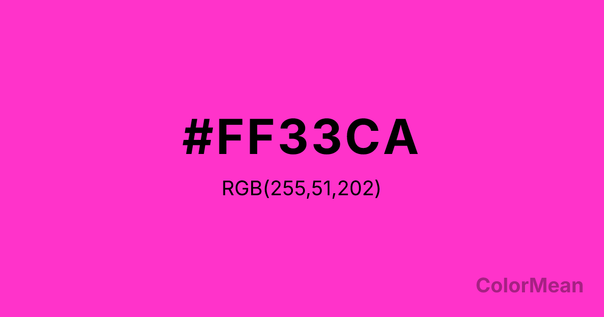 #FF33CA RGB value is (255, 51, 202). The hex color red value is 255, green is 51, and blue is 202. Its HSL format shows a hue of 316°, saturation of 100 percent, and lightness of 60 percent. The CMYK process values are 0 percent, 80 percent, 21 percent, 0 percent.