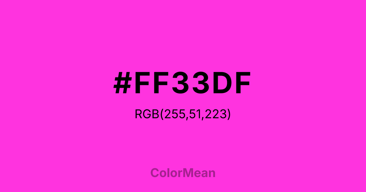 #FF33DF RGB value is (255, 51, 223). The hex color red value is 255, green is 51, and blue is 223. Its HSL format shows a hue of 309°, saturation of 100 percent, and lightness of 60 percent. The CMYK process values are 0 percent, 80 percent, 13 percent, 0 percent.