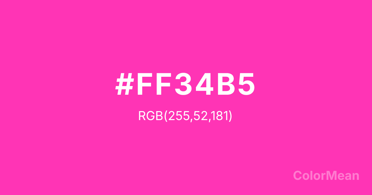 #FF34B5 RGB value is (255, 52, 181). The hex color red value is 255, green is 52, and blue is 181. Its HSL format shows a hue of 322°, saturation of 100 percent, and lightness of 60 percent. The CMYK process values are 0 percent, 80 percent, 29 percent, 0 percent.