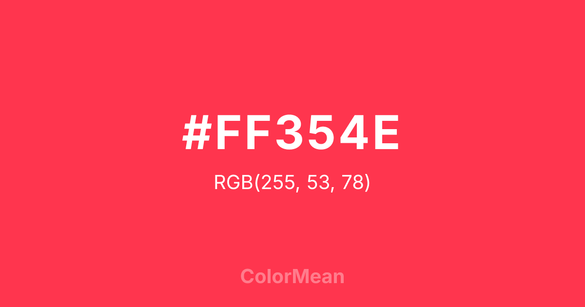 #FF354E RGB value is (255, 53, 78). The hex color red value is 255, green is 53, and blue is 78. Its HSL format shows a hue of 353°, saturation of 100 percent, and lightness of 60 percent. The CMYK process values are 0 percent, 79 percent, 69 percent, 0 percent.