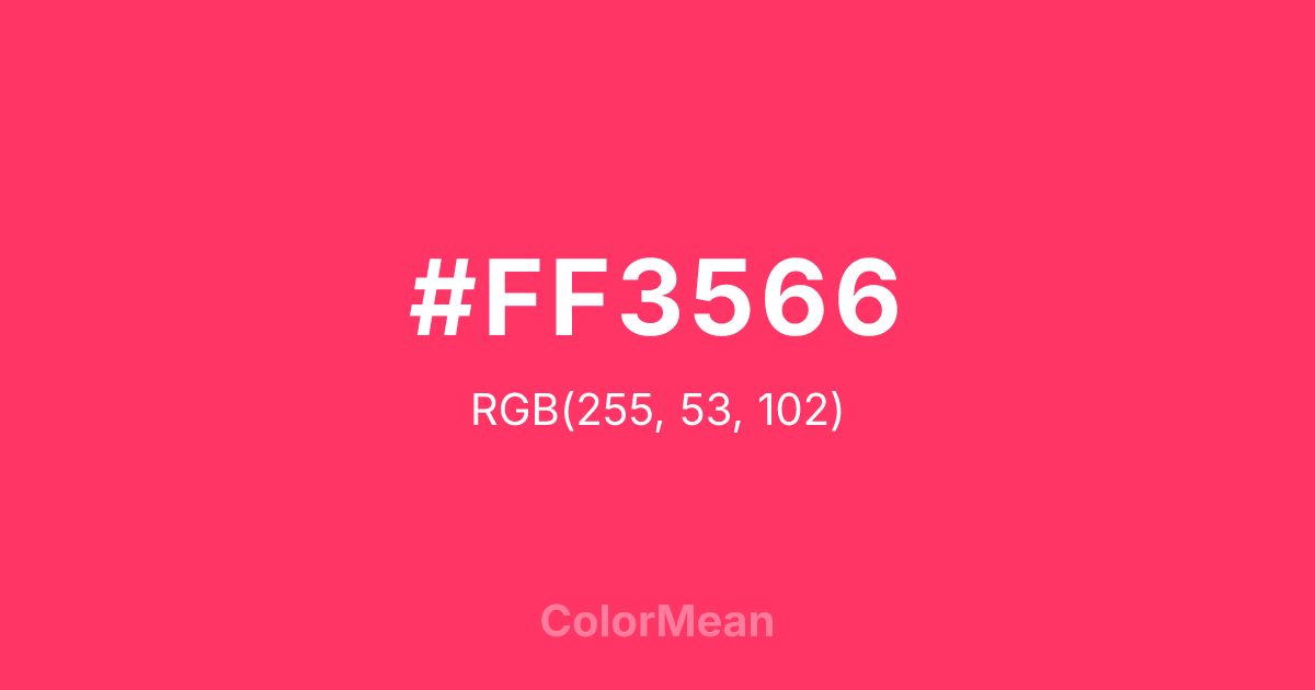 #FF3566 RGB value is (255, 53, 102). The hex color red value is 255, green is 53, and blue is 102. Its HSL format shows a hue of 345°, saturation of 100 percent, and lightness of 60 percent. The CMYK process values are 0 percent, 79 percent, 60 percent, 0 percent.