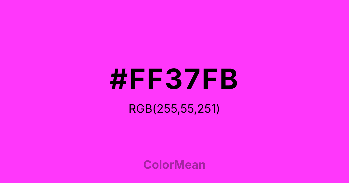 #FF37FB RGB value is (255, 55, 251). The hex color red value is 255, green is 55, and blue is 251. Its HSL format shows a hue of 301°, saturation of 100 percent, and lightness of 61 percent. The CMYK process values are 0 percent, 78 percent, 2 percent, 0 percent.