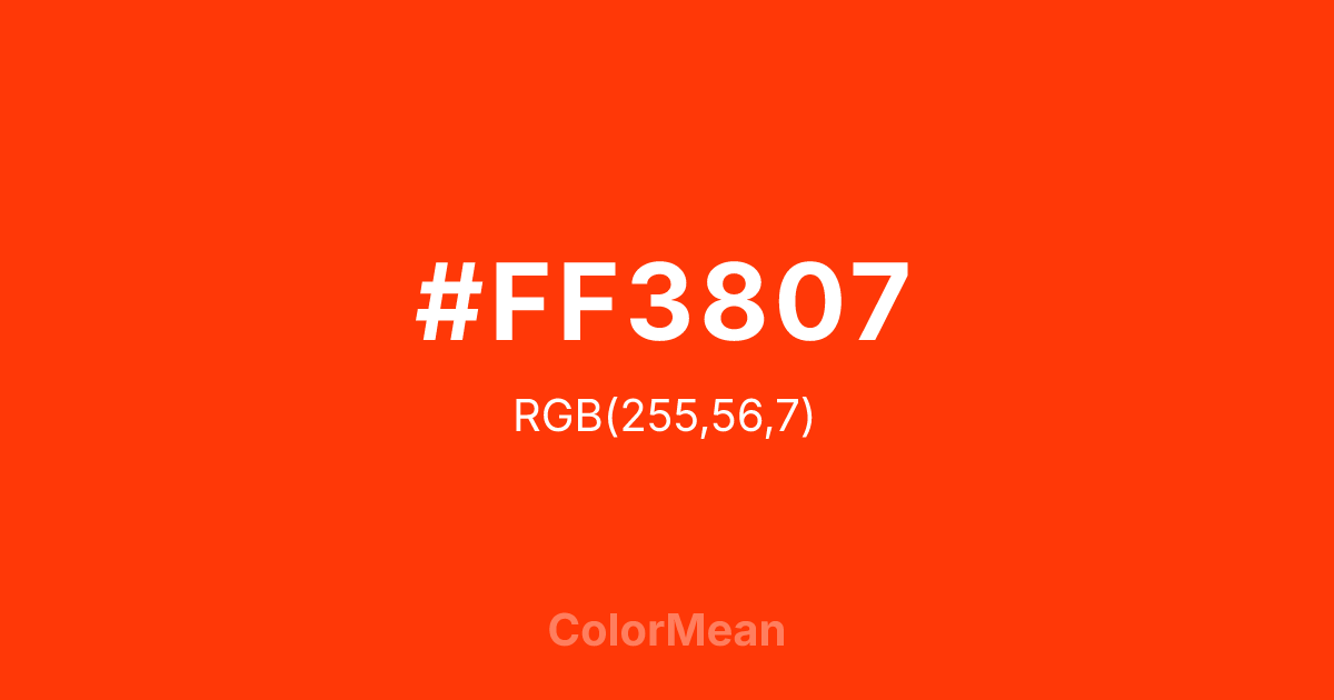 #FF3807 RGB value is (255, 56, 7). The hex color red value is 255, green is 56, and blue is 7. Its HSL format shows a hue of 12°, saturation of 100 percent, and lightness of 51 percent. The CMYK process values are 0 percent, 78 percent, 97 percent, 0 percent.