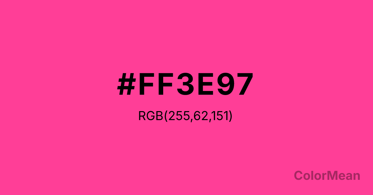 #FF3E97 RGB value is (255, 62, 151). The hex color red value is 255, green is 62, and blue is 151. Its HSL format shows a hue of 332°, saturation of 100 percent, and lightness of 62 percent. The CMYK process values are 0 percent, 76 percent, 41 percent, 0 percent.