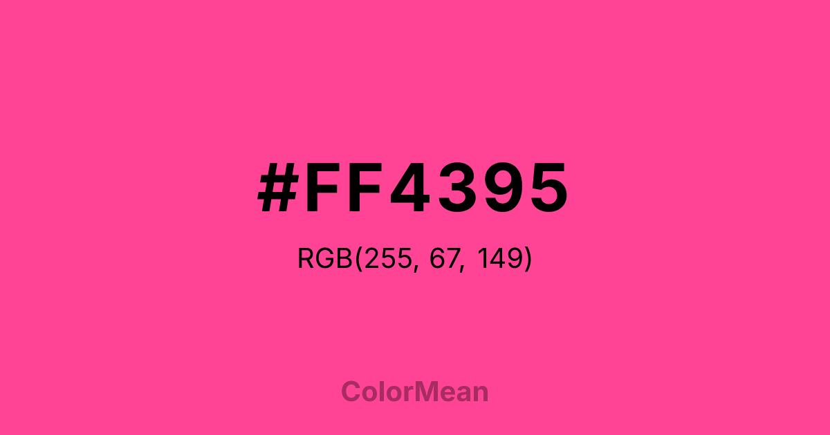 #FF4395 RGB value is (255, 67, 149). The hex color red value is 255, green is 67, and blue is 149. Its HSL format shows a hue of 334°, saturation of 100 percent, and lightness of 63 percent. The CMYK process values are 0 percent, 74 percent, 42 percent, 0 percent.