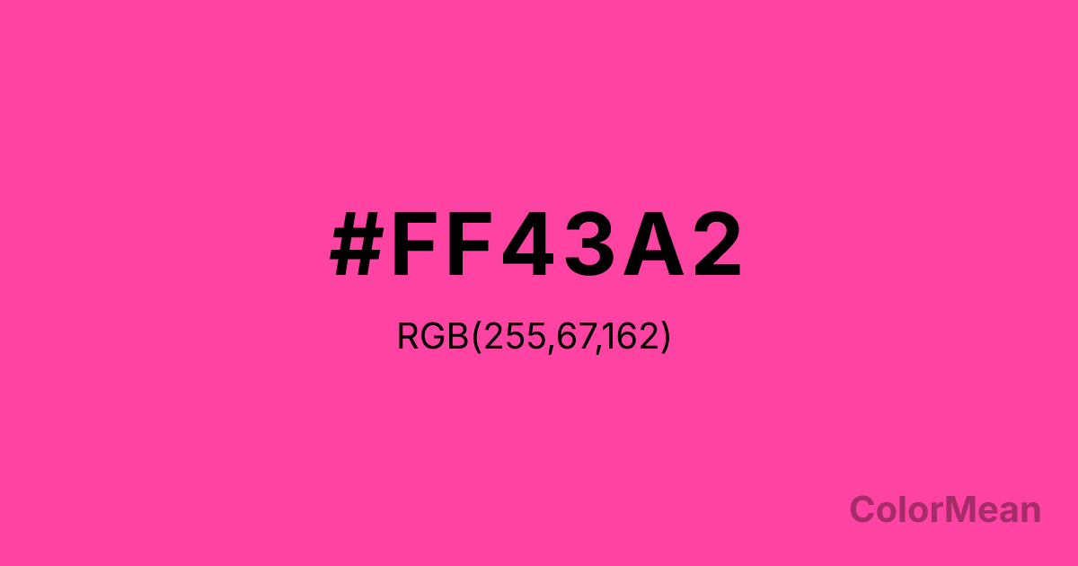#FF43A2 RGB value is (255, 67, 162). The hex color red value is 255, green is 67, and blue is 162. Its HSL format shows a hue of 330°, saturation of 100 percent, and lightness of 63 percent. The CMYK process values are 0 percent, 74 percent, 36 percent, 0 percent.