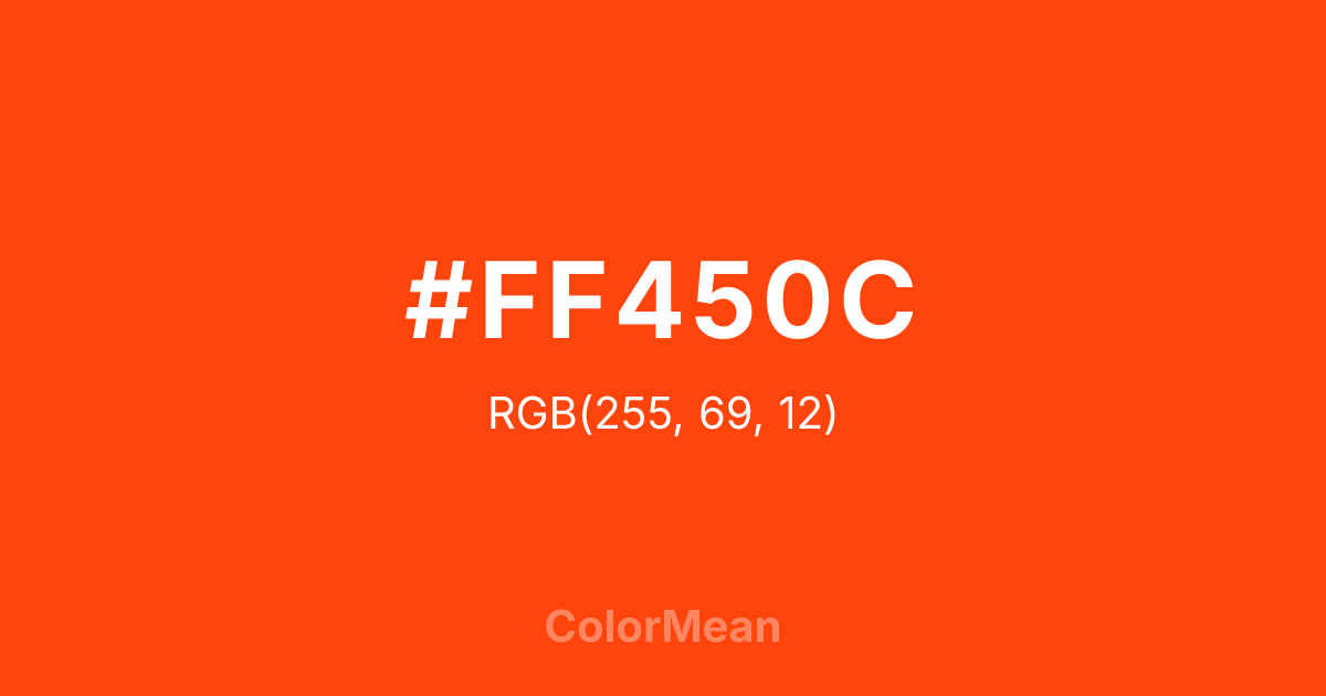 #FF450C RGB value is (255, 69, 12). The hex color red value is 255, green is 69, and blue is 12. Its HSL format shows a hue of 14°, saturation of 100 percent, and lightness of 52 percent. The CMYK process values are 0 percent, 73 percent, 95 percent, 0 percent.