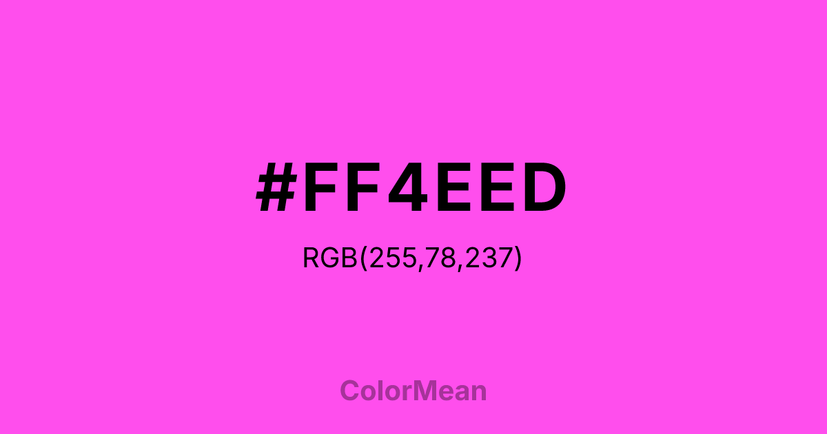 #FF4EED RGB value is (255, 78, 237). The hex color red value is 255, green is 78, and blue is 237. Its HSL format shows a hue of 306°, saturation of 100 percent, and lightness of 65 percent. The CMYK process values are 0 percent, 69 percent, 7 percent, 0 percent.
