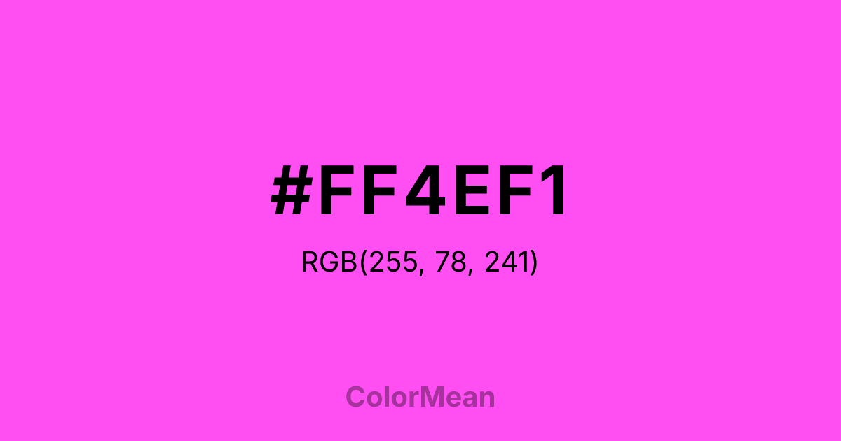 #FF4EF1 RGB value is (255, 78, 241). The hex color red value is 255, green is 78, and blue is 241. Its HSL format shows a hue of 305°, saturation of 100 percent, and lightness of 65 percent. The CMYK process values are 0 percent, 69 percent, 5 percent, 0 percent.