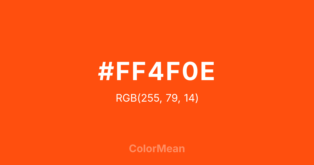 #FF4F0E RGB value is (255, 79, 14). The hex color red value is 255, green is 79, and blue is 14. Its HSL format shows a hue of 16°, saturation of 100 percent, and lightness of 53 percent. The CMYK process values are 0 percent, 69 percent, 95 percent, 0 percent.