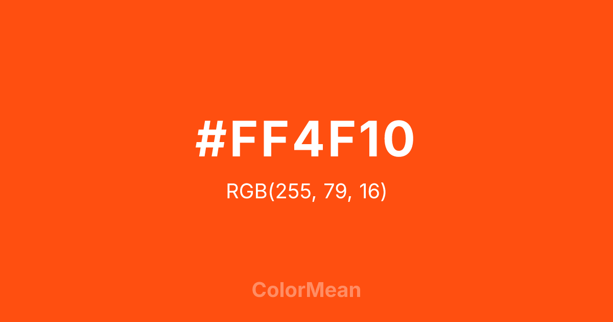 #FF4F10 RGB value is (255, 79, 16). The hex color red value is 255, green is 79, and blue is 16. Its HSL format shows a hue of 16°, saturation of 100 percent, and lightness of 53 percent. The CMYK process values are 0 percent, 69 percent, 94 percent, 0 percent.