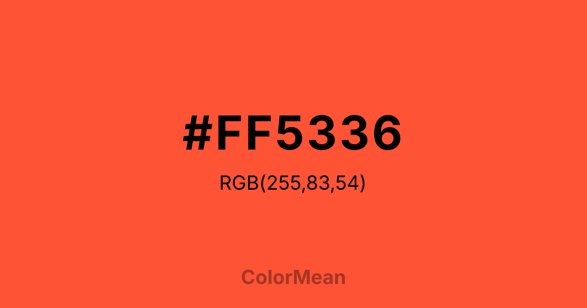 #FF5336 RGB value is (255, 83, 54). The hex color red value is 255, green is 83, and blue is 54. Its HSL format shows a hue of 9°, saturation of 100 percent, and lightness of 61 percent. The CMYK process values are 0 percent, 67 percent, 79 percent, 0 percent.
