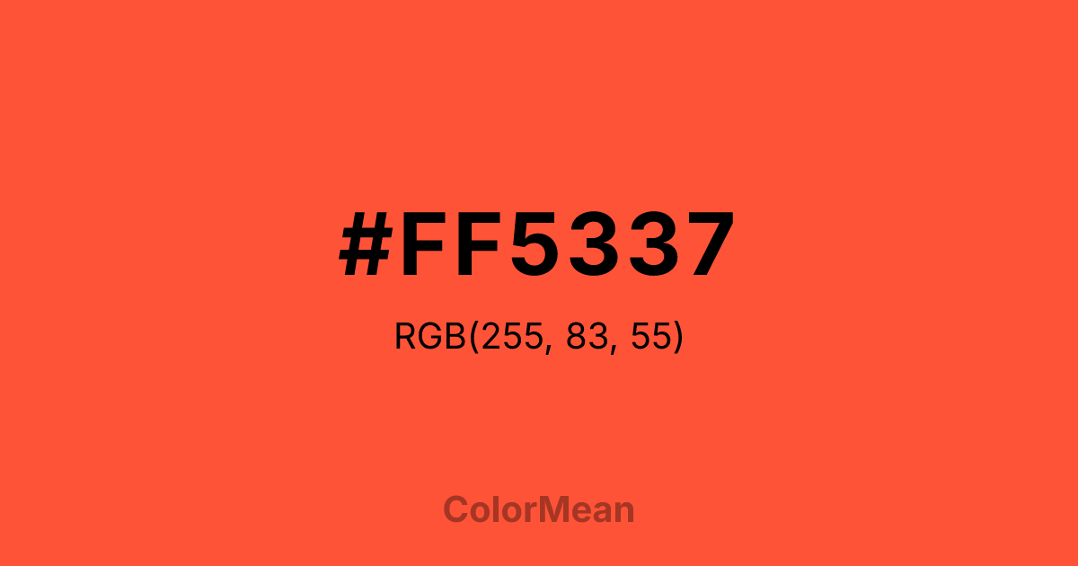 #FF5337 RGB value is (255, 83, 55). The hex color red value is 255, green is 83, and blue is 55. Its HSL format shows a hue of 8°, saturation of 100 percent, and lightness of 61 percent. The CMYK process values are 0 percent, 67 percent, 78 percent, 0 percent.