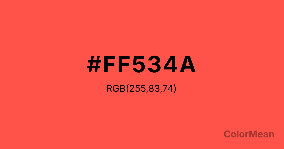 #FF534A RGB value is (255, 83, 74). The hex color red value is 255, green is 83, and blue is 74. Its HSL format shows a hue of 3°, saturation of 100 percent, and lightness of 65 percent. The CMYK process values are 0 percent, 67 percent, 71 percent, 0 percent.
