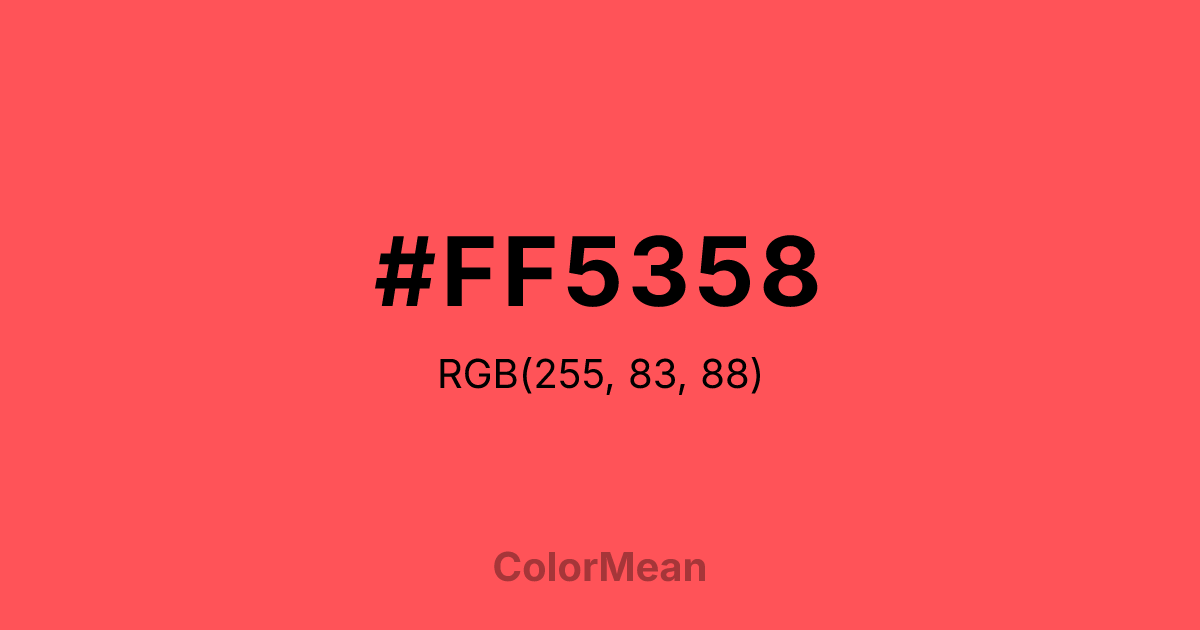 #FF5358 RGB value is (255, 83, 88). The hex color red value is 255, green is 83, and blue is 88. Its HSL format shows a hue of 358°, saturation of 100 percent, and lightness of 66 percent. The CMYK process values are 0 percent, 67 percent, 65 percent, 0 percent.