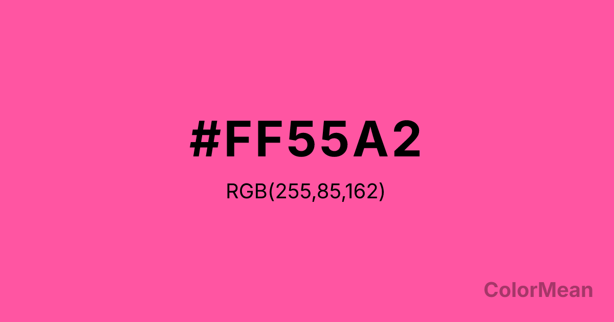 #FF55A2 RGB value is (255, 85, 162). The hex color red value is 255, green is 85, and blue is 162. Its HSL format shows a hue of 333°, saturation of 100 percent, and lightness of 67 percent. The CMYK process values are 0 percent, 67 percent, 36 percent, 0 percent.
