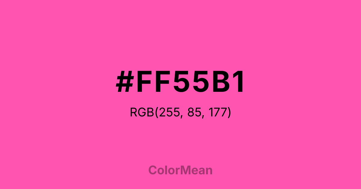 #FF55B1 RGB value is (255, 85, 177). The hex color red value is 255, green is 85, and blue is 177. Its HSL format shows a hue of 328°, saturation of 100 percent, and lightness of 67 percent. The CMYK process values are 0 percent, 67 percent, 31 percent, 0 percent.