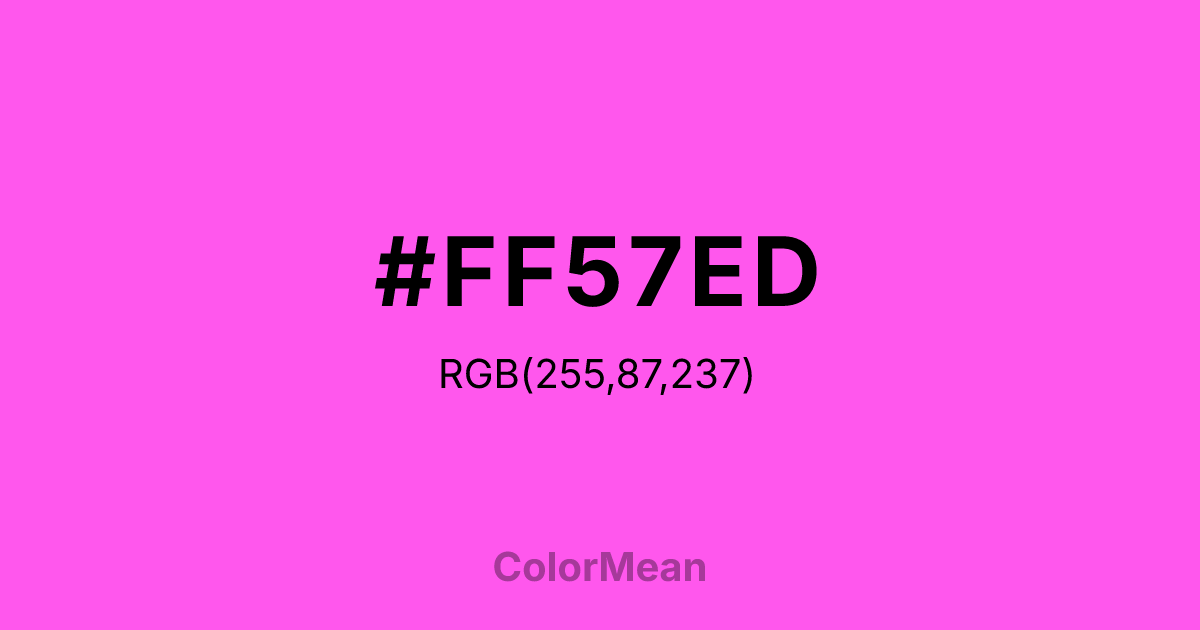 #FF57ED RGB value is (255, 87, 237). The hex color red value is 255, green is 87, and blue is 237. Its HSL format shows a hue of 306°, saturation of 100 percent, and lightness of 67 percent. The CMYK process values are 0 percent, 66 percent, 7 percent, 0 percent.