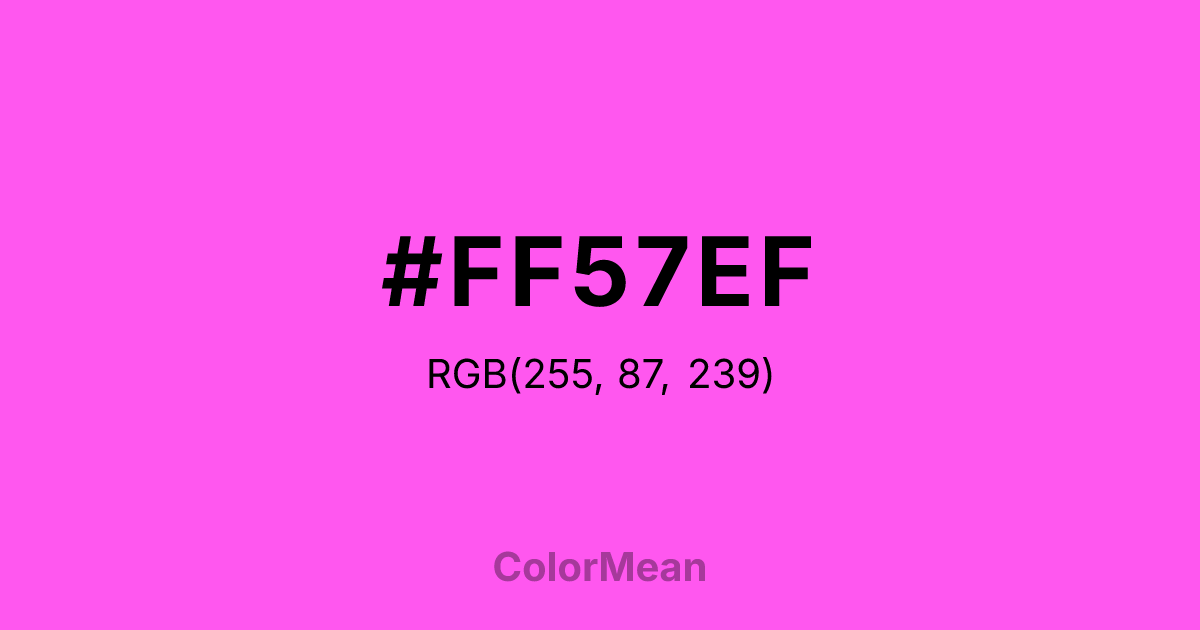 #FF57EF RGB value is (255, 87, 239). The hex color red value is 255, green is 87, and blue is 239. Its HSL format shows a hue of 306°, saturation of 100 percent, and lightness of 67 percent. The CMYK process values are 0 percent, 66 percent, 6 percent, 0 percent.