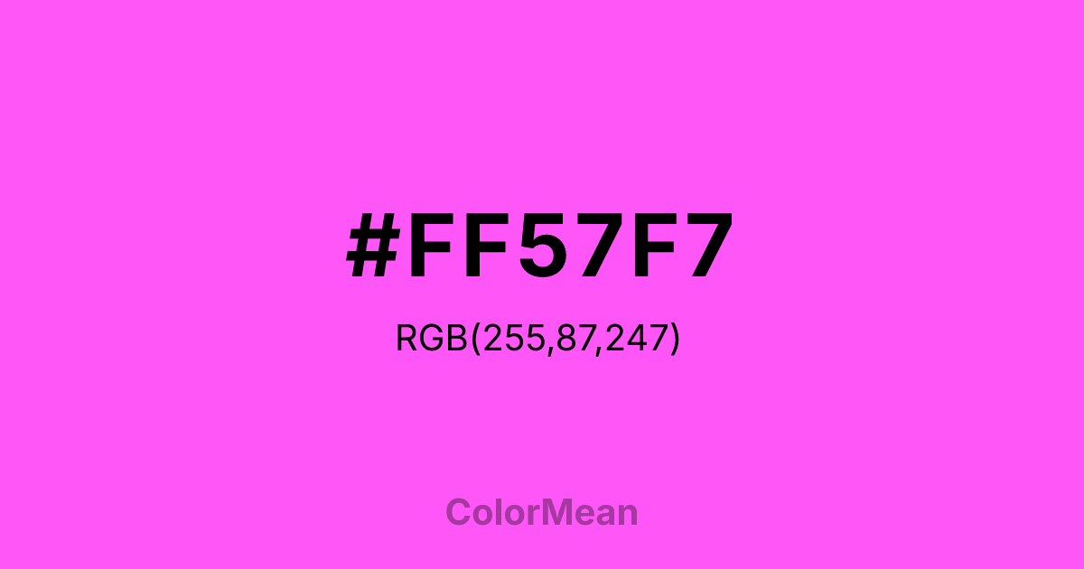 #FF57F7 RGB value is (255, 87, 247). The hex color red value is 255, green is 87, and blue is 247. Its HSL format shows a hue of 303°, saturation of 100 percent, and lightness of 67 percent. The CMYK process values are 0 percent, 66 percent, 3 percent, 0 percent.